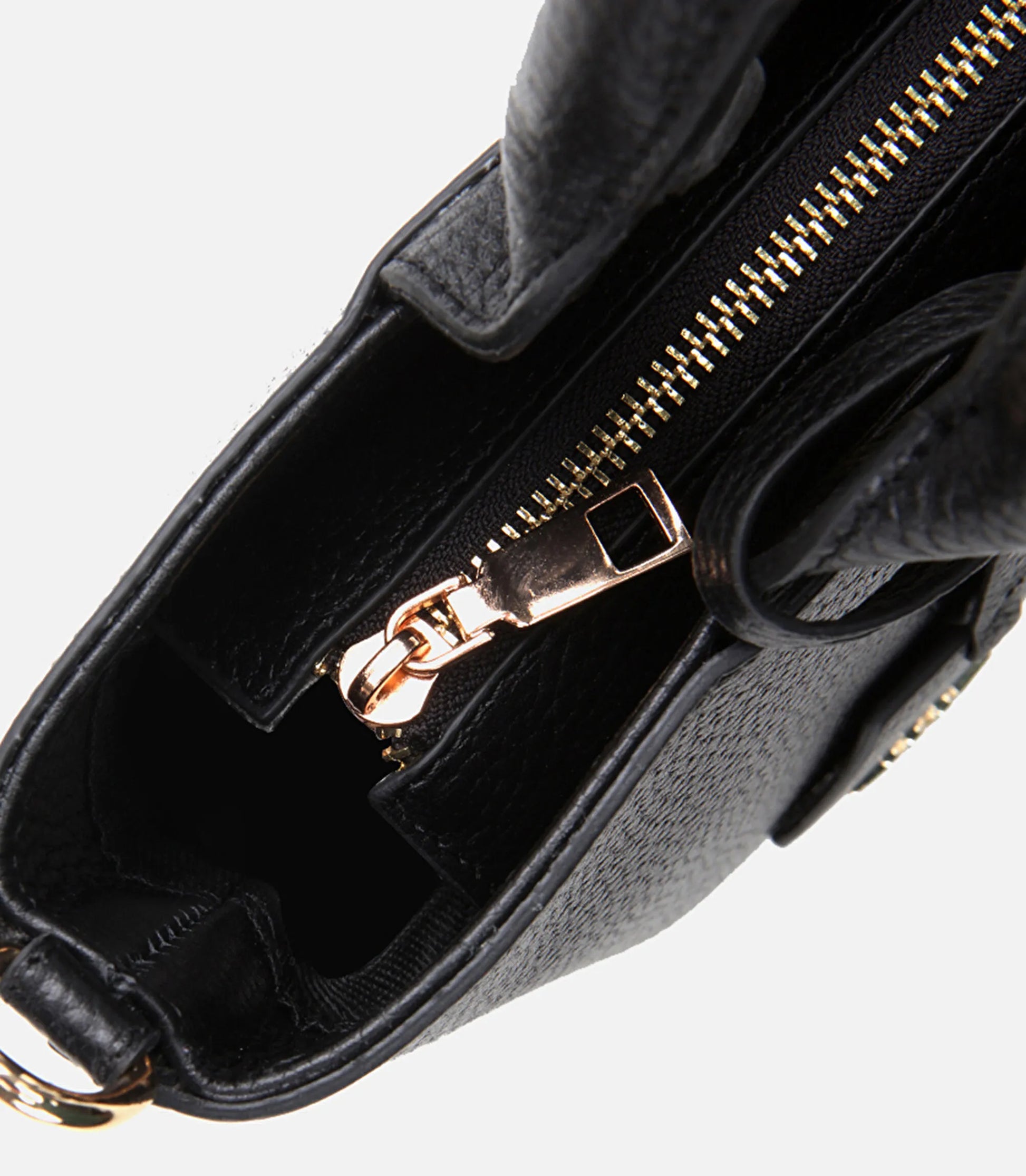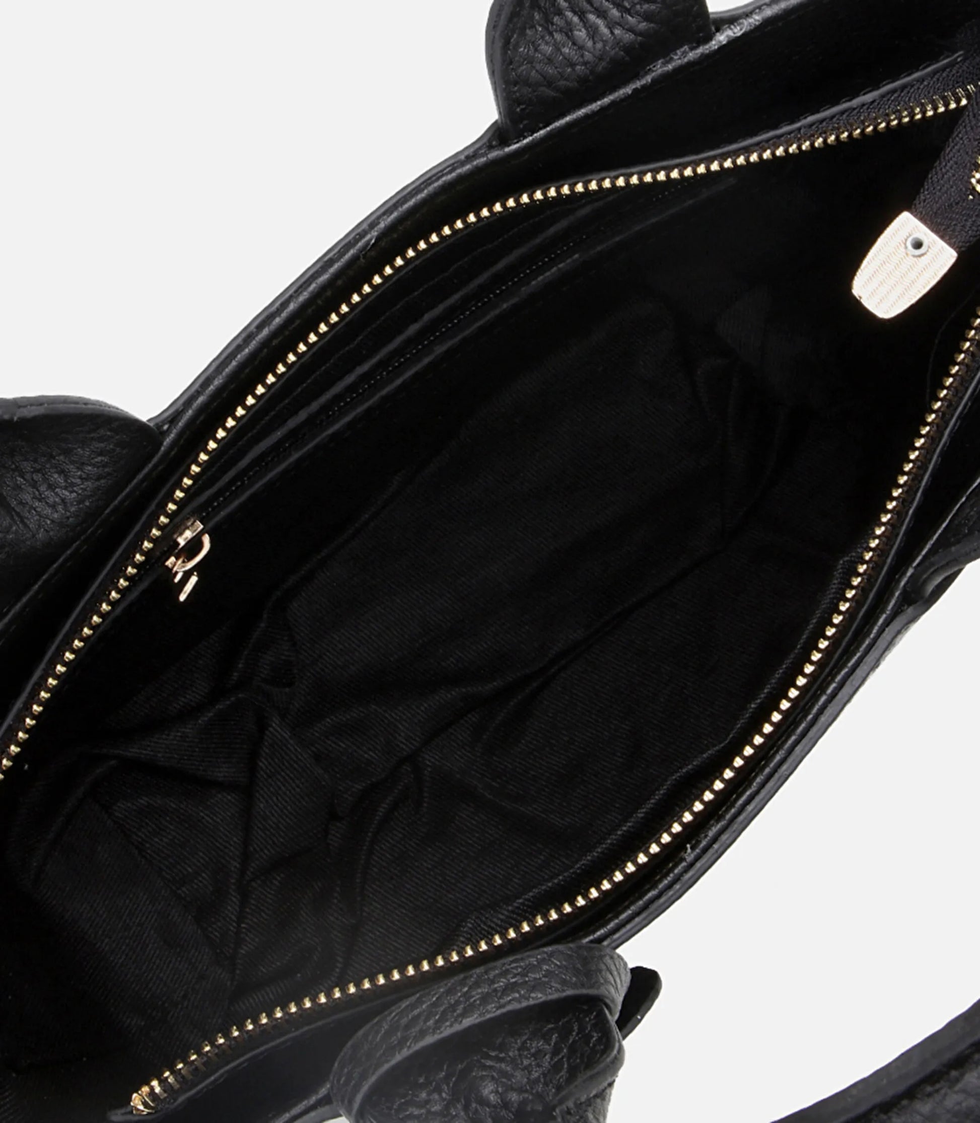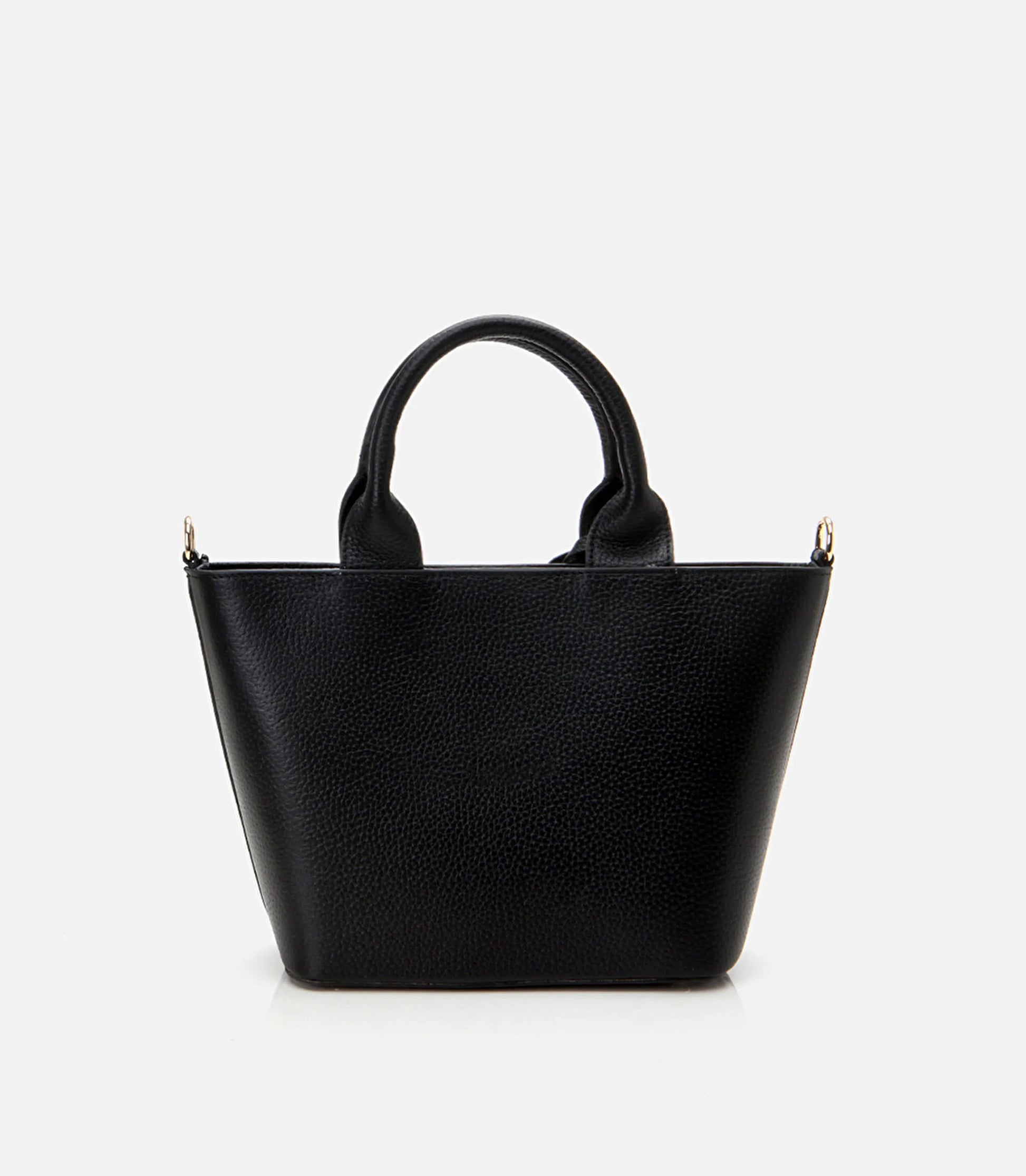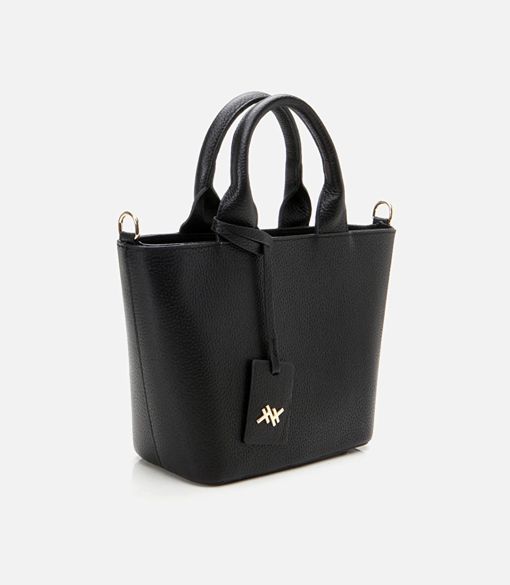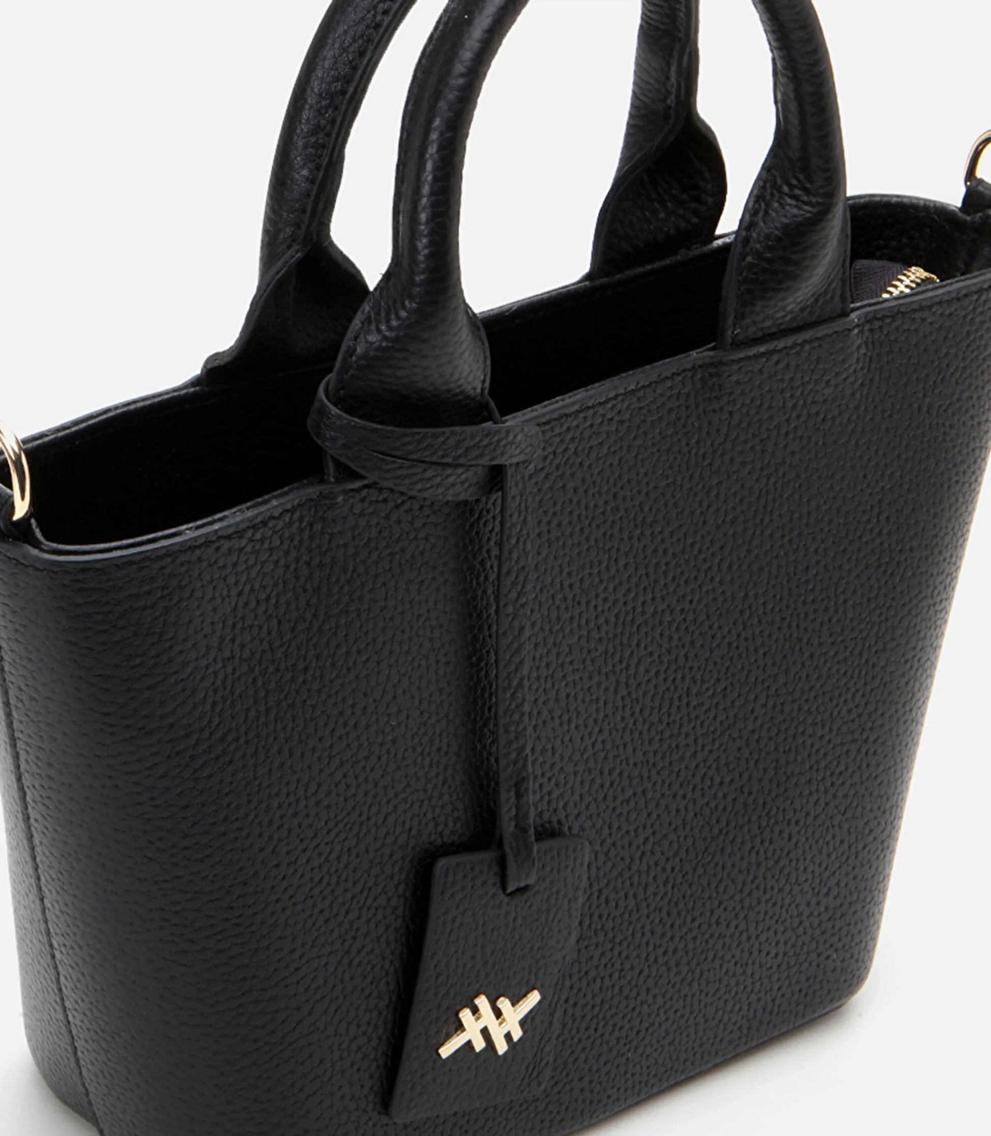 A compact black leather tote that feels quietly luxurious, like a favourite piece of jewellery you reach for every day. Crafted from softly pebbled leather with rounded top handles and a detachable crossbody strap, it’s the kind of bag you throw on for a quick coffee, a gallery visit or date night and always look effortlessly put-together.