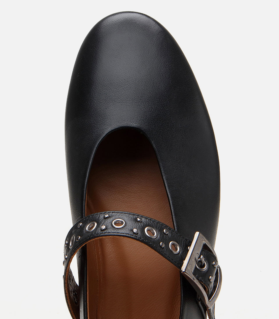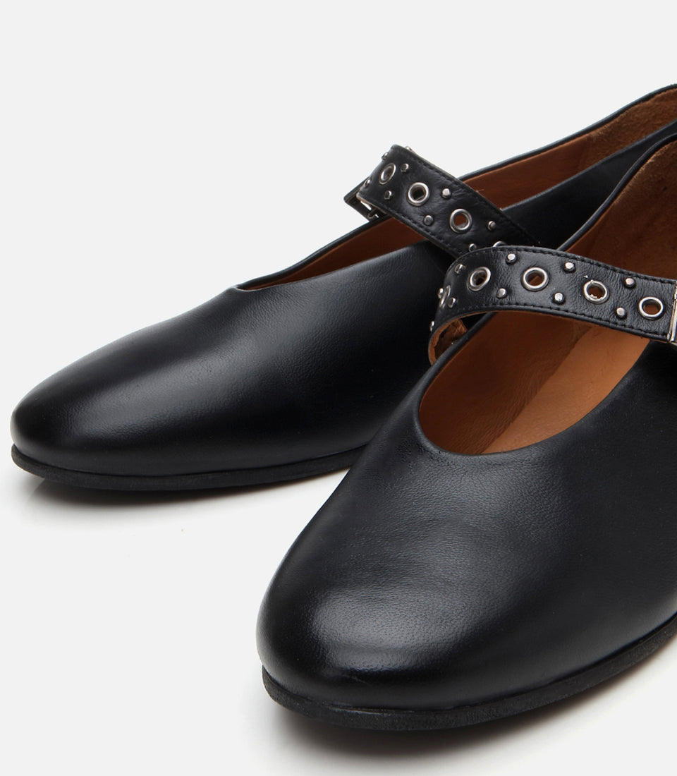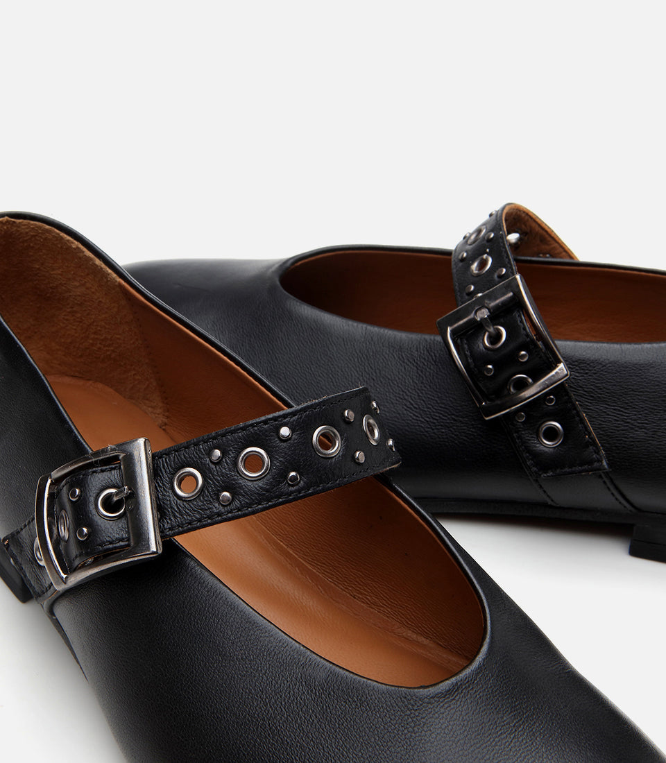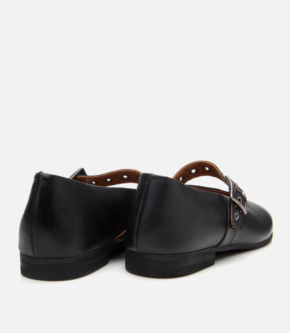 Women’s Leather Mary Jane Buckle Strap Flats - Black