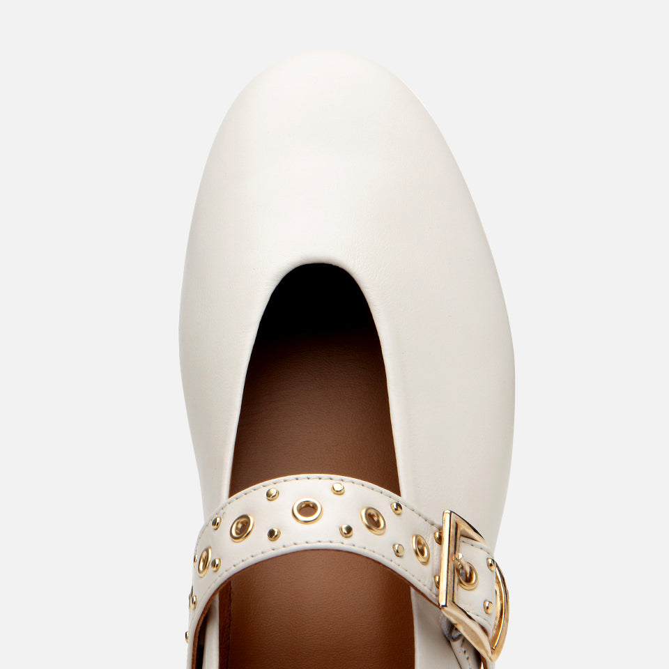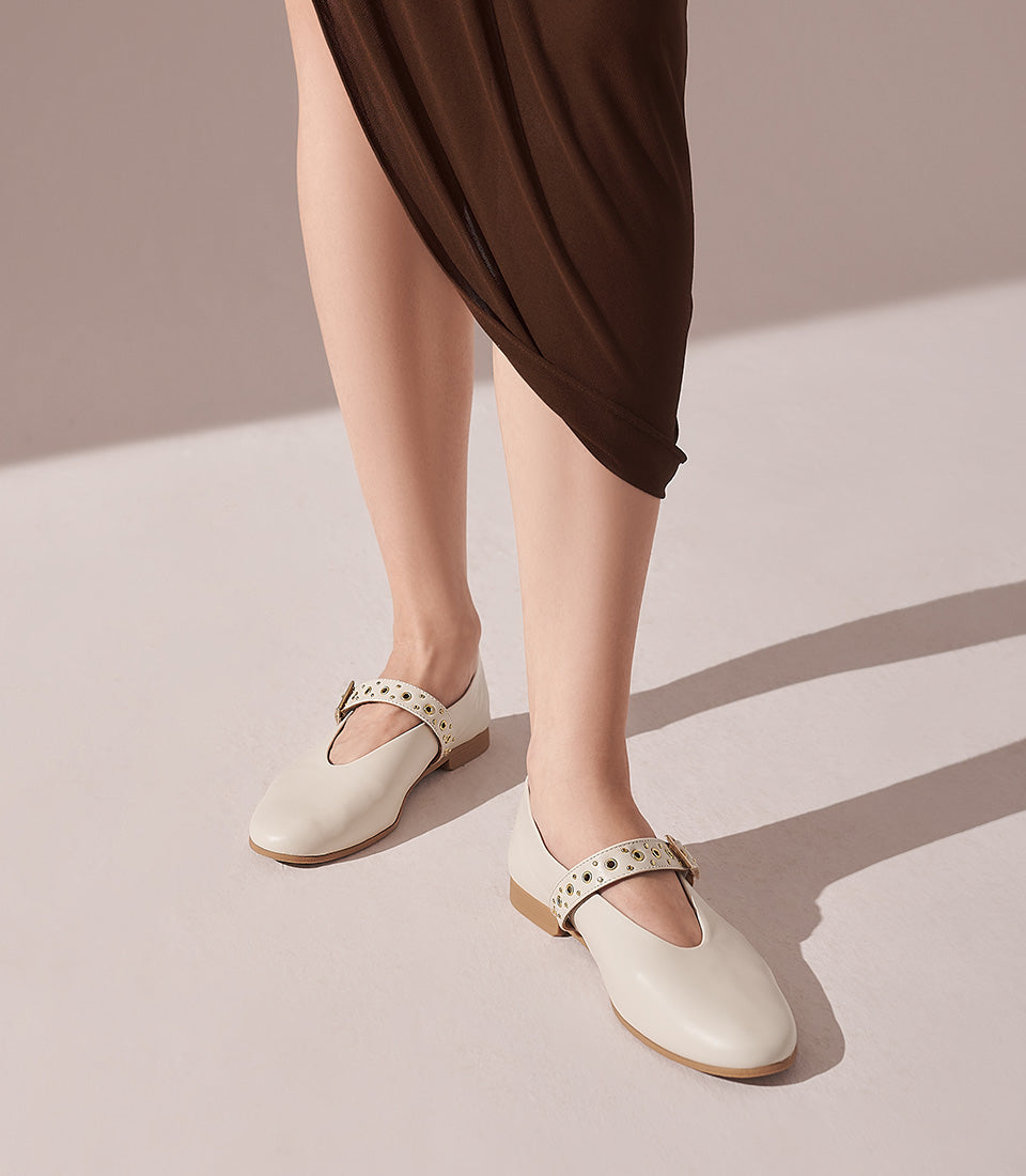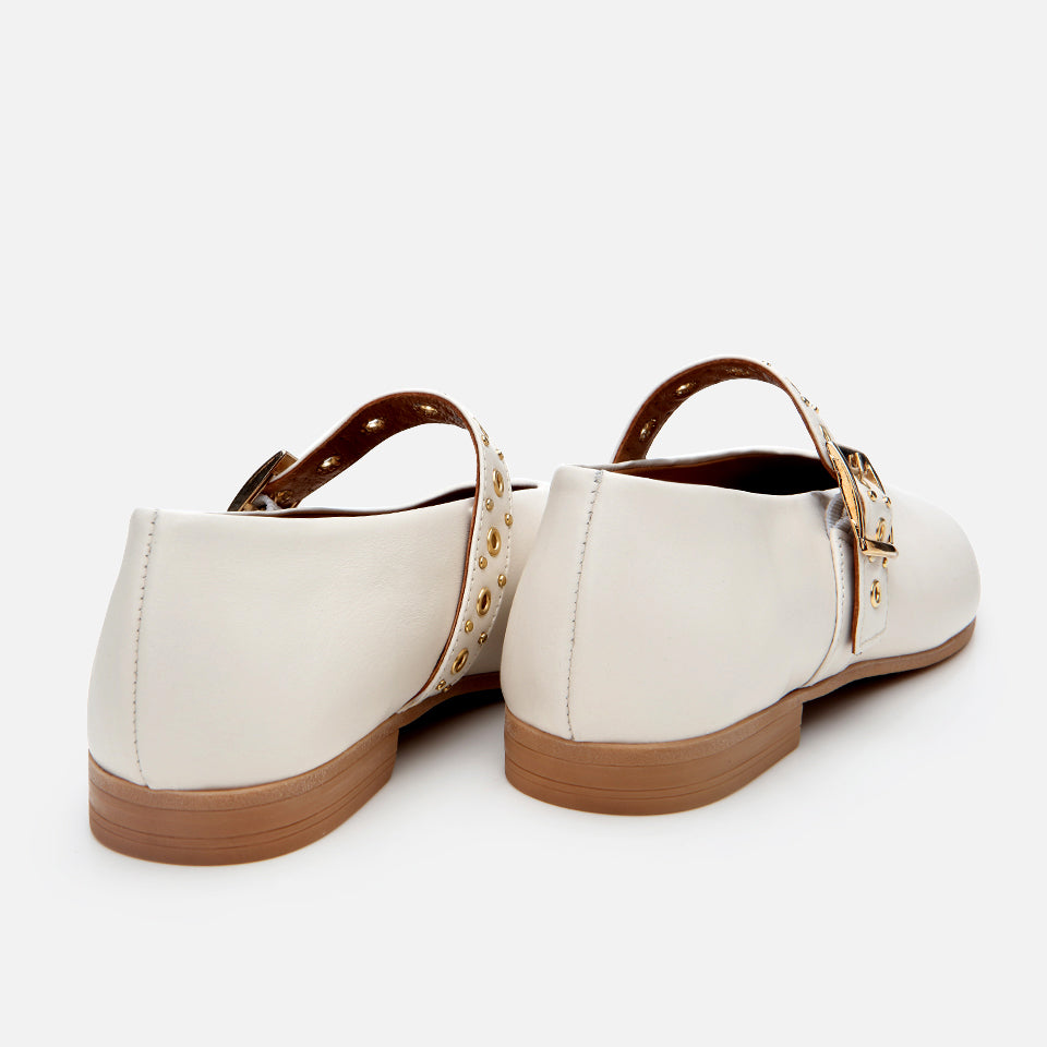 Women’s Leather Mary Jane Buckle Strap Flats - Ecru