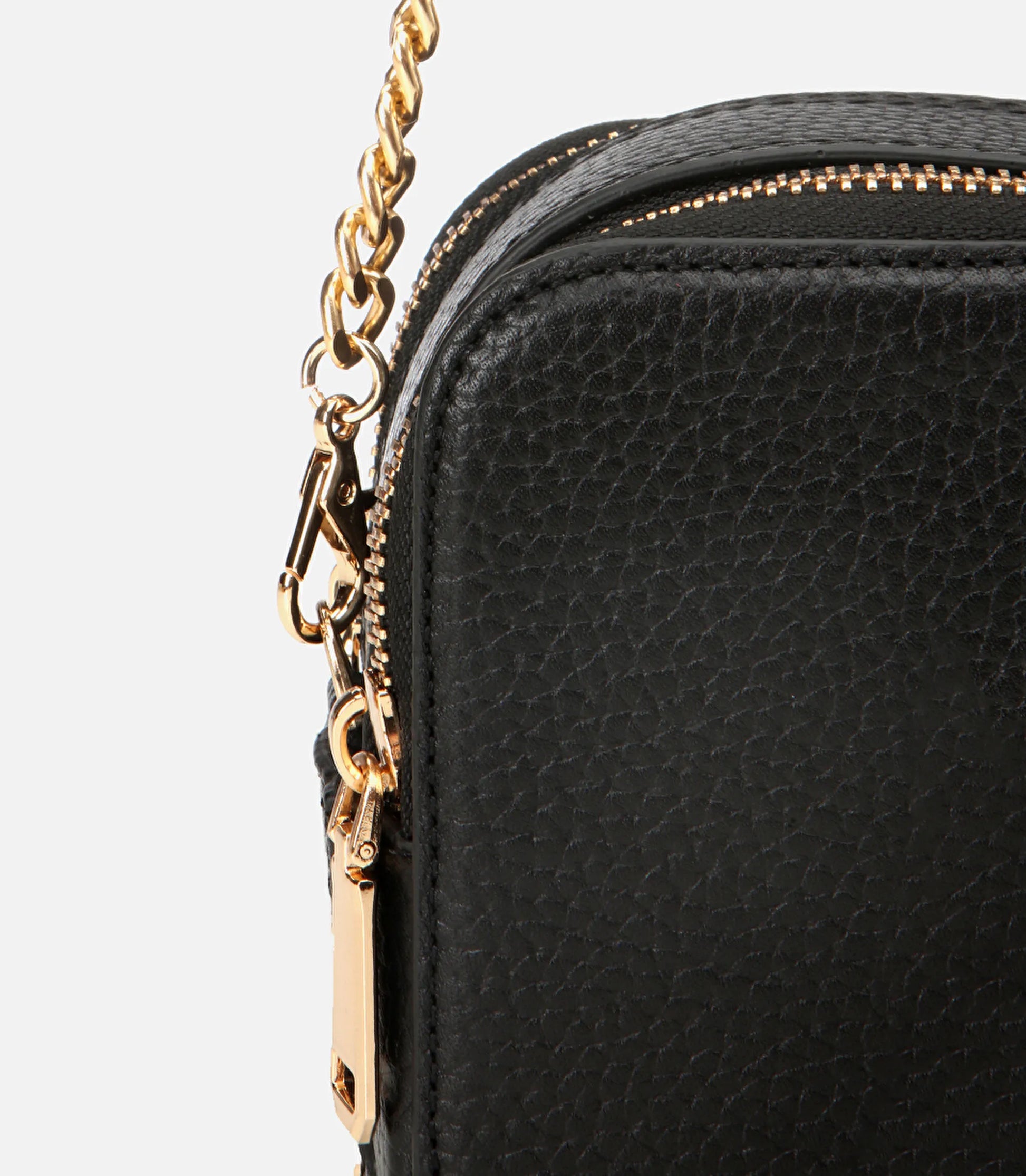 A compact black leather mini bag with a sleek chain strap, designed for hands-free city days and late nights out. Crafted from softly pebbled leather with a neat rectangular shape, it sits lightly across the body, keeping phone, cards and keys close while you move from coffee runs to dinner reservations.