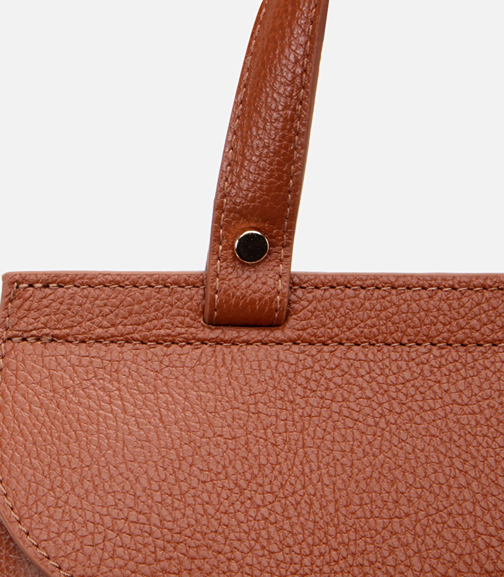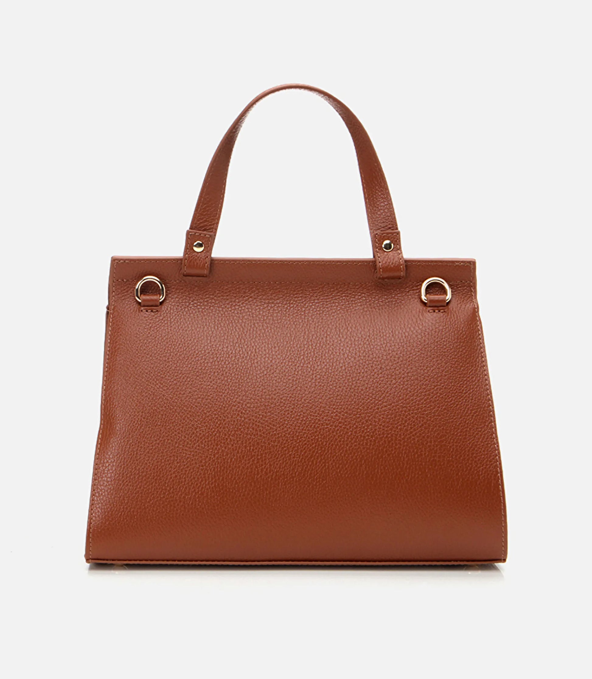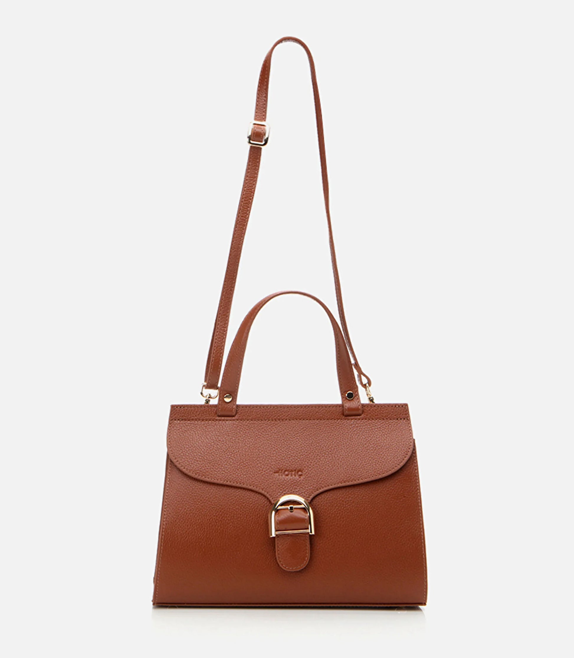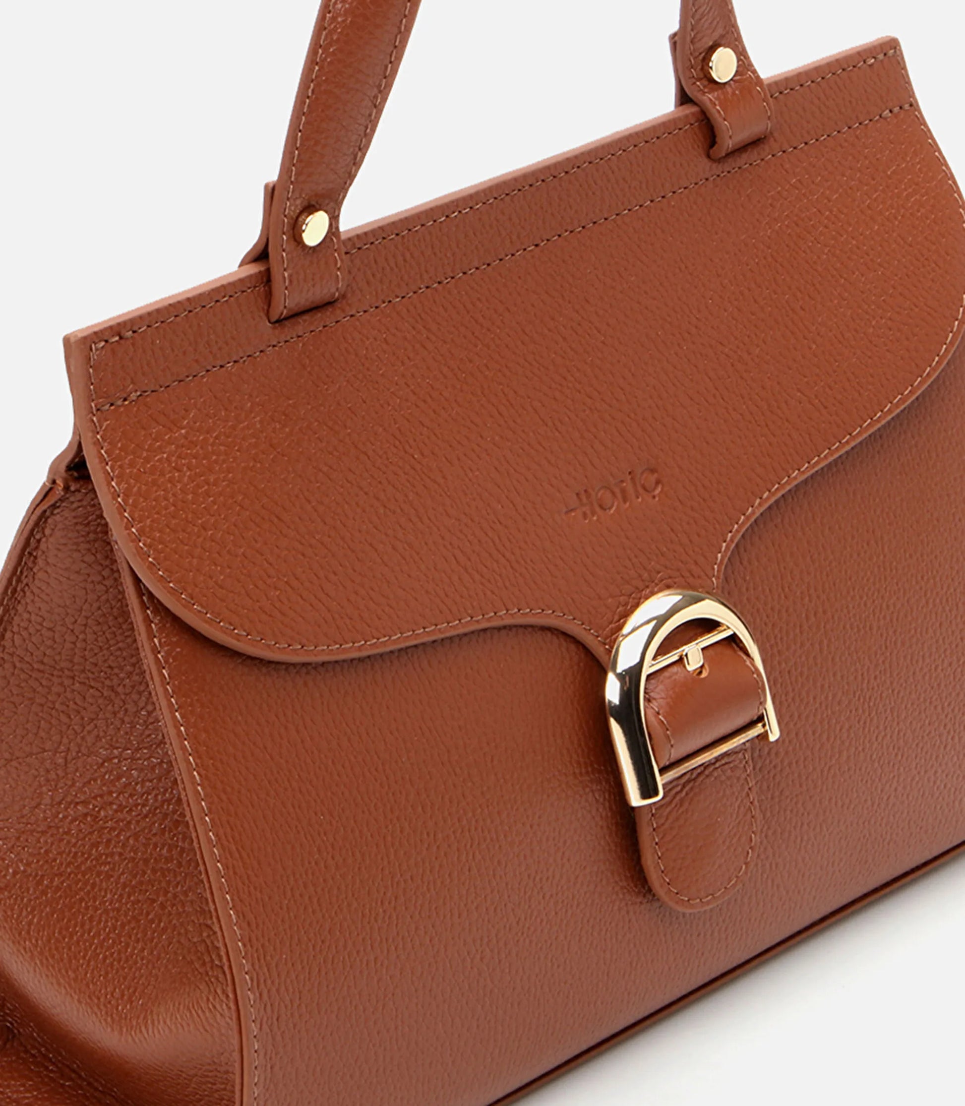 A structured tan leather shoulder bag with a softly curved flap and statement buckle detail, made for women who like their everyday style to feel as polished as an evening look. Crafted from pebbled leather with twin top handles and a slim shoulder strap, it’s the bag you carry to the office, to dinner and straight into the weekend without missing a beat.