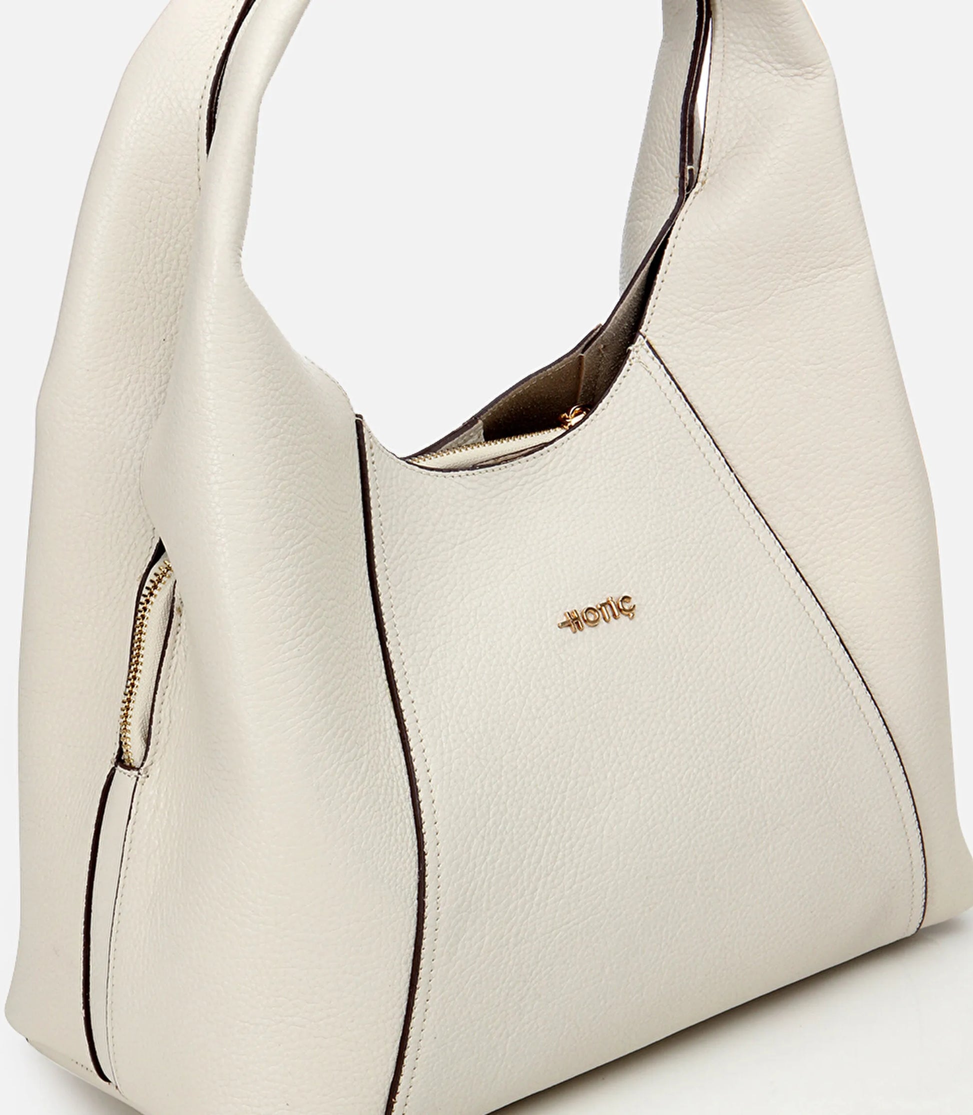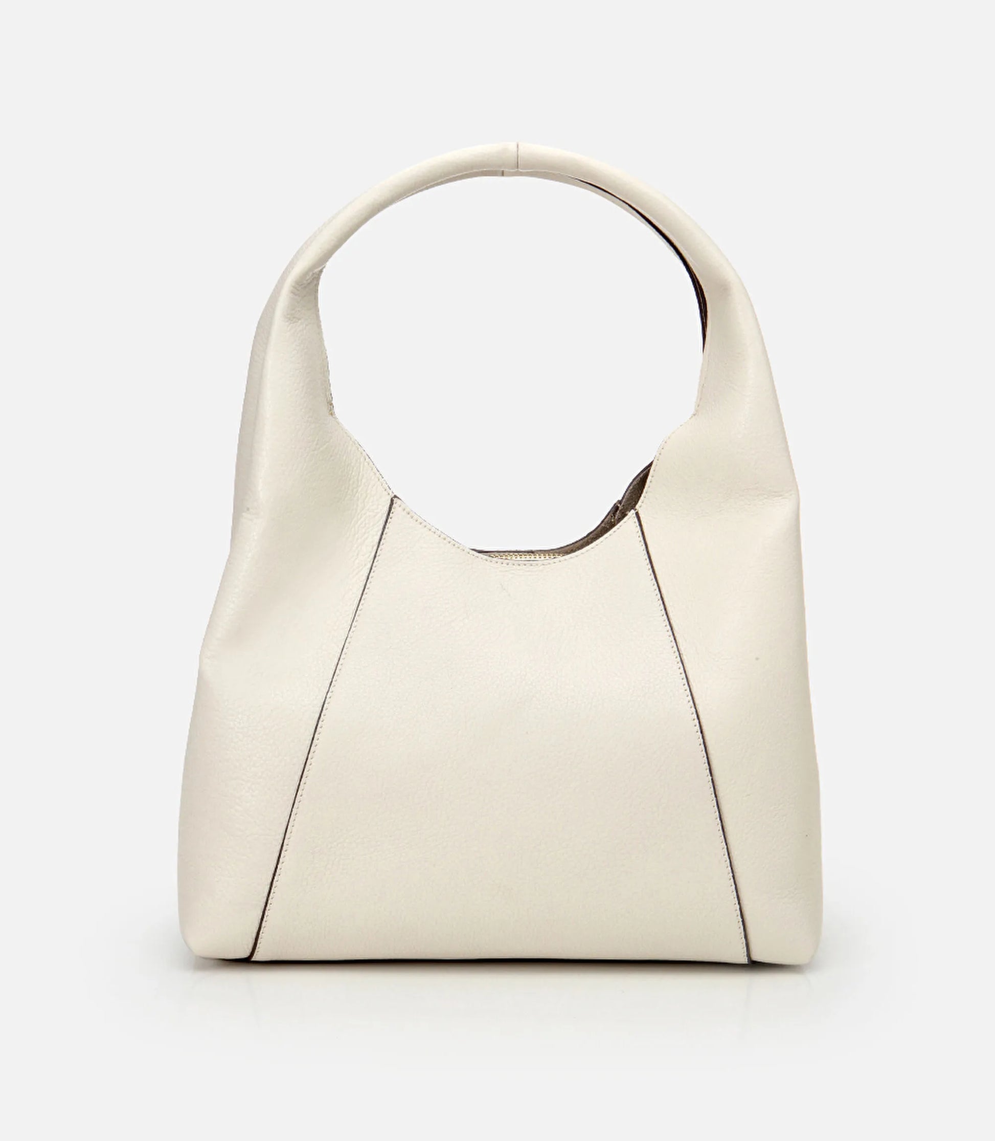 A softly structured hobo-style shoulder bag in rich ecru leather, made for women who live out of their bag from morning to late evening. The curved handle slips easily over the shoulder, while the relaxed shape and central zip compartment keep your everyday essentials secure but always within easy reach.